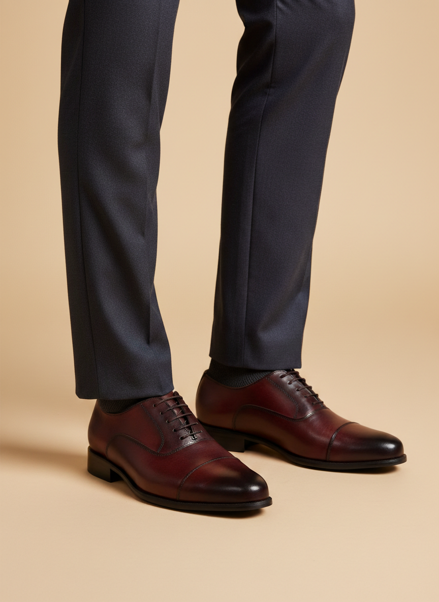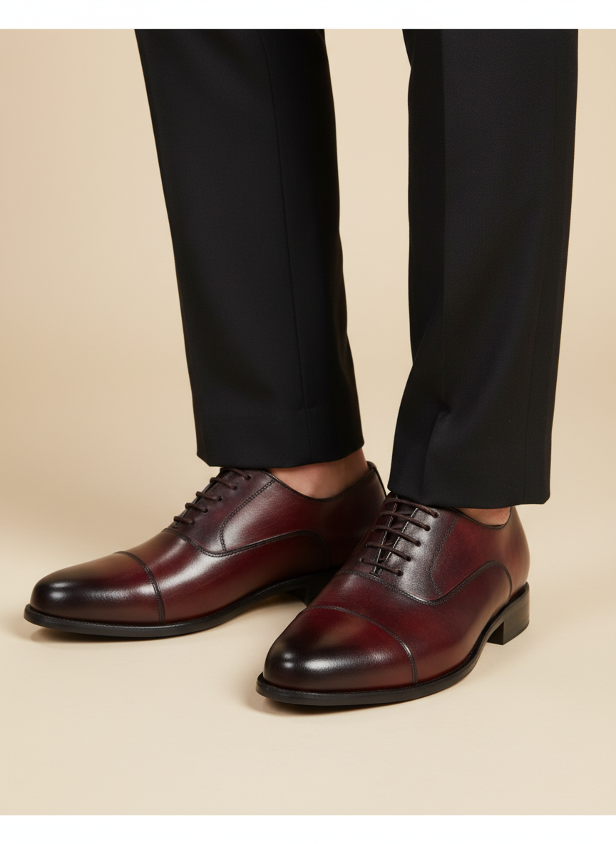 Dark Cherry Cap Toe Oxford is a timeless essential, meticulously handcrafted from premium calfskin leather. Designed with a clean, elegant silhouette, this classic style reflects traditional shoemaking refined for the modern gentleman.